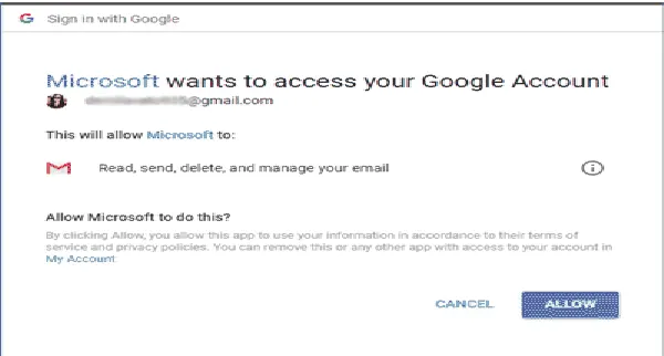 - 不久後提供正確的 Gmail 或 G Suite 帳戶詳細信息。微軟將請求訪問谷歌帳戶的許可。讓它繼續進行下去。