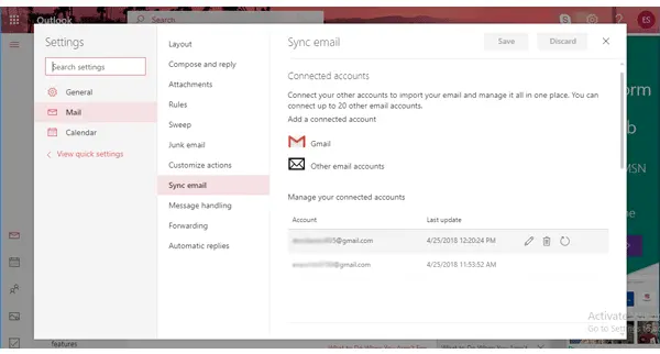 - 幾秒鐘之內,您的 Gmail 帳戶就會添加到 Outlook.com 並顯示出來。這樣,Gmail 與 Outlook.com 的同步過程就完成了。此外,它還提供了管理同步帳戶的選項,即您可以輕鬆編輯甚至刪除它。