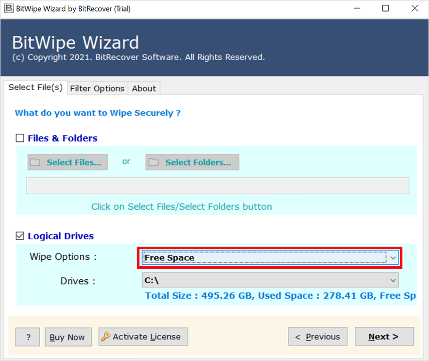 BitRecover bitWipe 嚮導是最好的、最值得信賴的、經過認證的軟件,可以永久刪除計算機中的所有數據。它具有驚人的功能。通過使用該軟件,用戶可以根據自己的需要輕鬆擦除計算機數據。