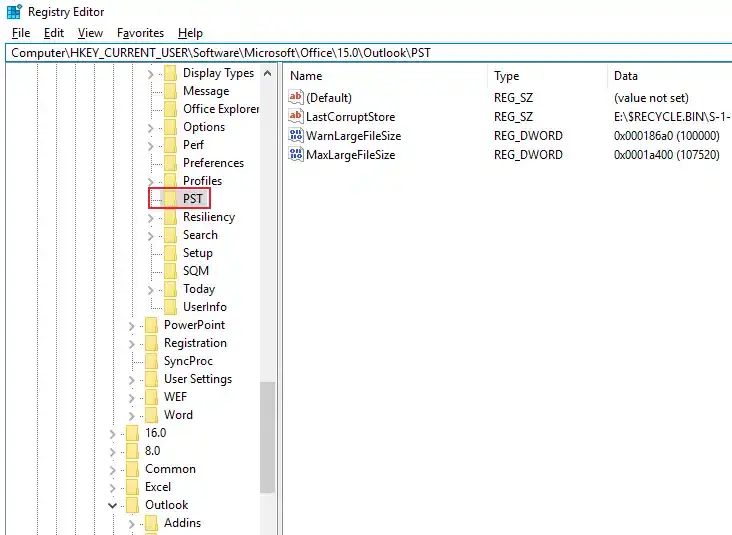 打開註冊表編輯器,轉到 HKEY_CURRENT_USER\Software\Microsoft\Office\15.0\Outlook\PST 並創建最大文件大小和警告文件大小條目。將 MaxFileSize 設置為 107374182400(對於 100 GB)。重新啟動 Outlook 以應用更改。