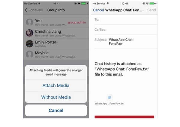 如果您想要備份一些對話,WhatsApp 允許您使用本機功能將它們通過電子郵件發送給自己或任何联係人。您還可以選擇在備份郵件中排除或包含附件。但是,這不會將您的聊天記錄恢復到您的 iPhone 上。但您將擁有想要保存在電子郵件中的所有 WhatsApp 聊天記錄的備份。