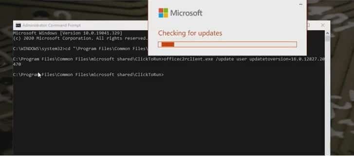 - 這將打開office的ClickToRun文件夾,在這裡輸入命令officec2rclient.exe /更新用戶 updatetoversion=16.0.12827.20470並按回車鍵。