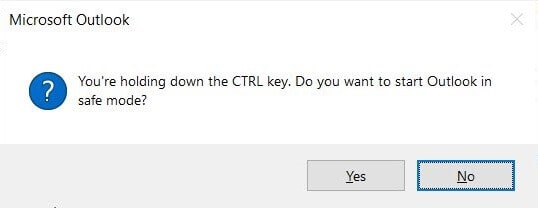 另外,您可以按住 ctrl 鍵並啟動 Outlook,這將決定您是否要以安全模式啟動,單擊“是”以最基本的形式啟動 Outlook,不受任何加載項外部程序的干擾。