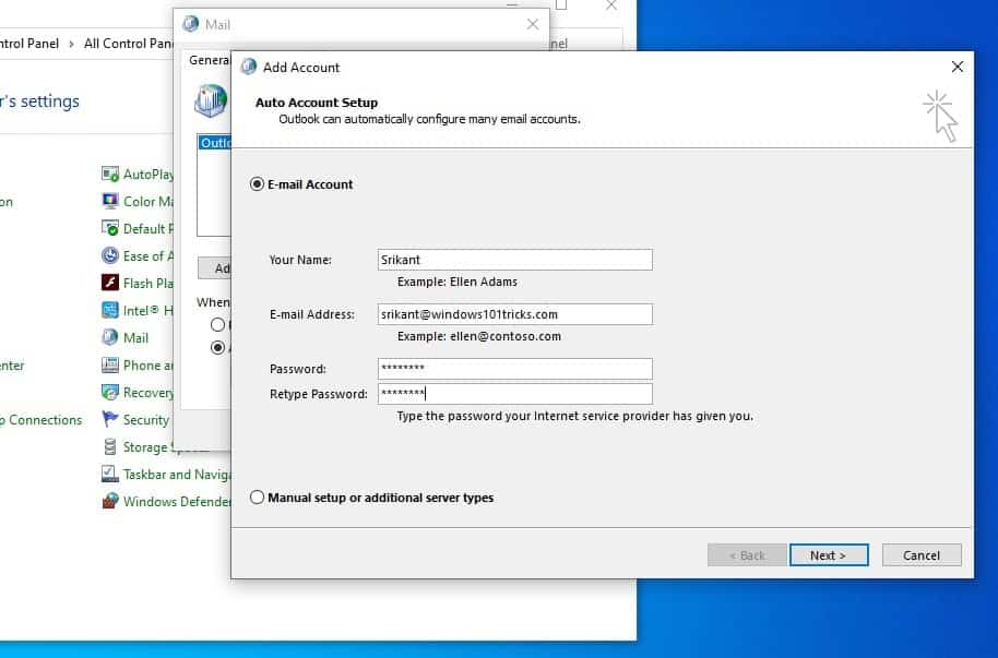 - 輸入您在 Outlook 中使用的主電子郵件帳戶的電子郵件地址和密碼,然後逐步完成創建配置文件的步驟。