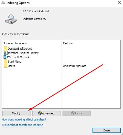 - 打開控制面板並轉到“索引選項”,然後單擊“修改”