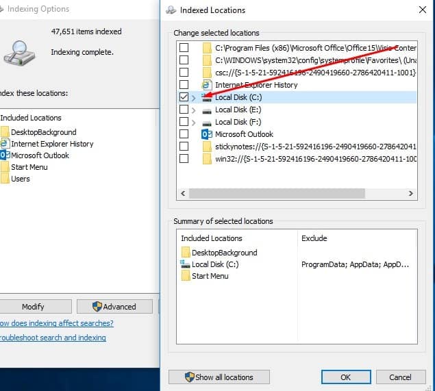 要再次執行此操作,請打開 Windows 索引選項,單擊“修改”並取消選擇除 OS C: 驅動器之外的所有選定位置,如下所示。