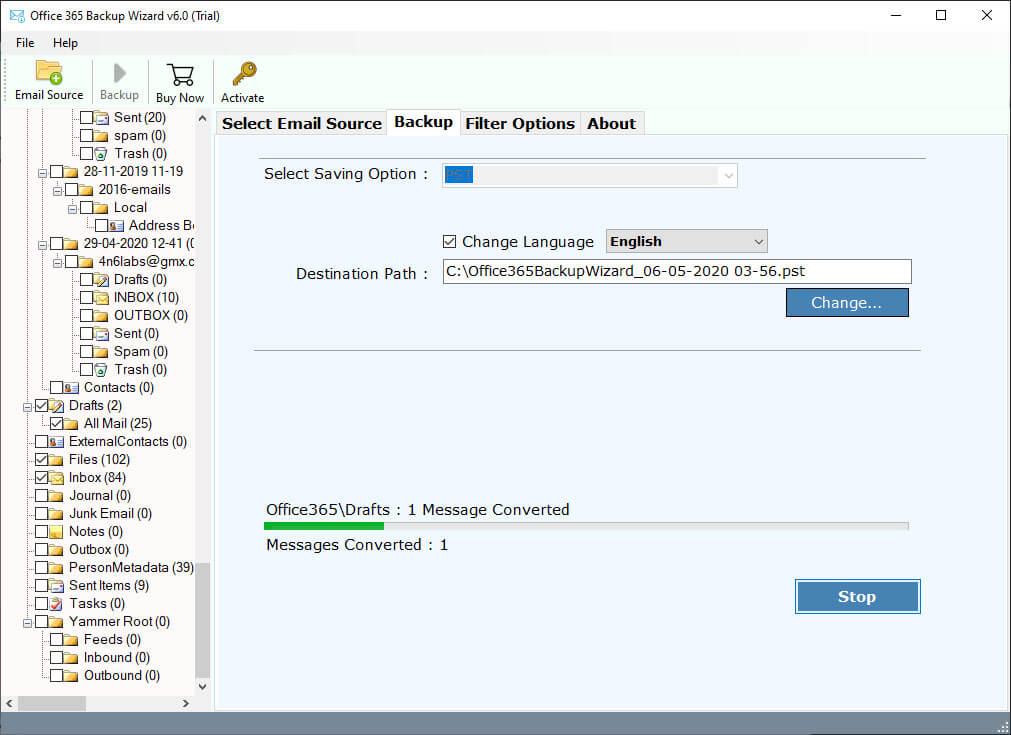 - 輸入所需的目的地位置(或根據要求更改)和單擊備份按鈕開始下載Office 365存檔郵箱中的PST格式。