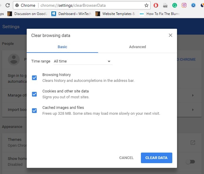 - 類型chrome://settings/clearBrowserData在地址欄上並按 Enter 鍵。