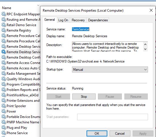 - 右鍵單擊遠程桌面服務並選擇屬性