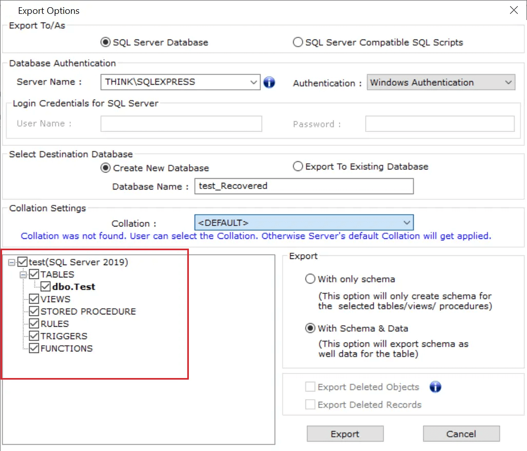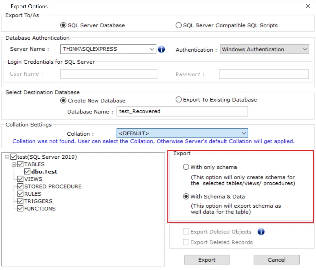 - 單擊導出按鈕選擇“使用架構和數據導出”選項完成遷移過程後。