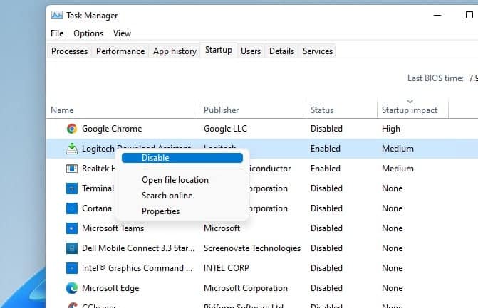 - 要在啟動時停用應用程序,請右鍵單擊相關應用程序,然後單擊“禁用“ 按鈕。