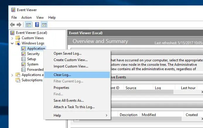 - 然後右鍵單擊其下的子文件夾(應用程序),然後單擊清除日誌