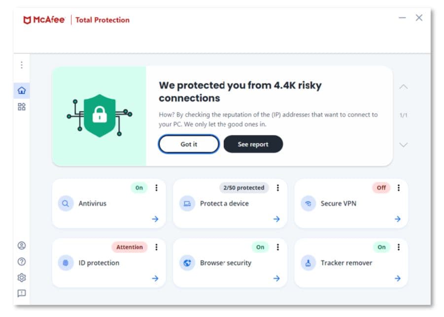 McAfee Total Protection 提供廣泛的功能,從防病毒保護到身份盜竊預防。該程序還提供全面保護功能,包括瀏覽時實時在線保護免受病毒、惡意軟件和勒索軟件的侵害、反網絡釣魚功能、密碼管理器保護您的憑據、防火牆和身份保護以及數據的加密存儲。