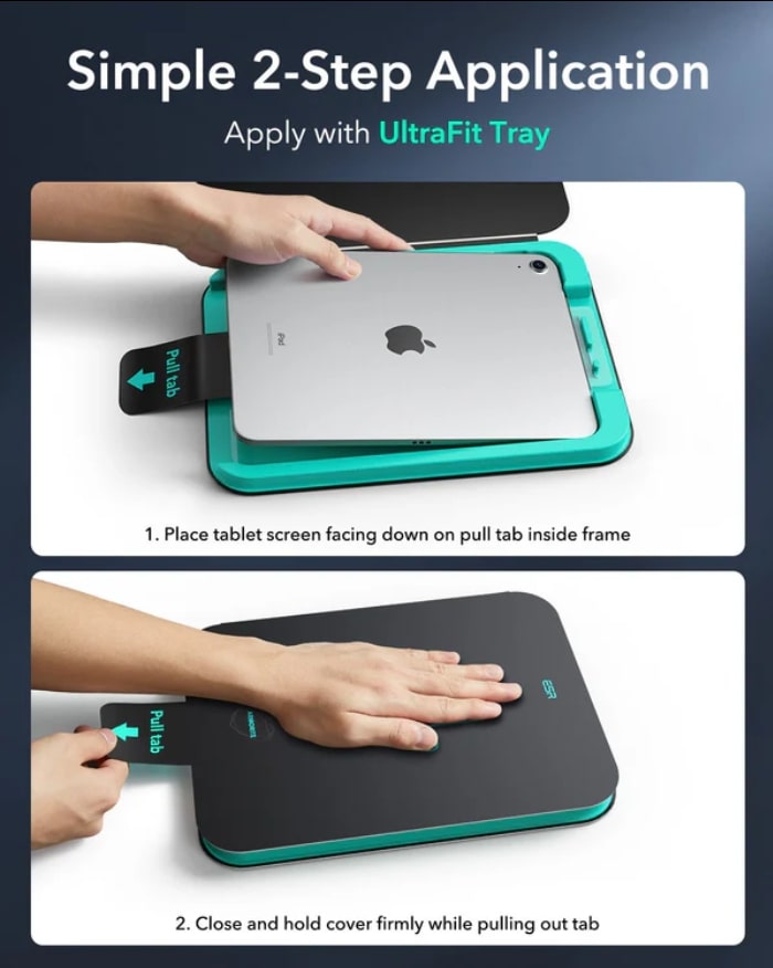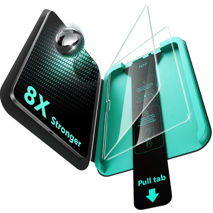 ESR 屏幕保護膜配有一個 UltraFit 托盤,該托盤帶有拉標籤,無論是用於手機還是 iPad,都可以輕鬆使用。要貼上屏幕保護膜,請將設備插入托盤,對蓋子施加壓力,然後輕輕取下拉標籤。
