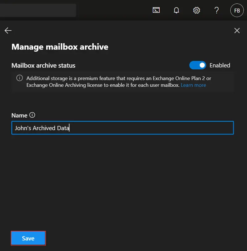 - 啟用存檔,為郵箱存檔文件夾命名,然後按節省。