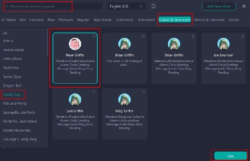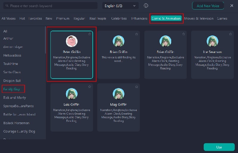 - 2在頂部的“漫畫與動畫”類別中找到“惡搞之家”。除了彼得·格里芬的配音外,還有其他《惡搞之家》動漫角色的配音。或者您可以選擇直接在頂部搜索框中搜索“Peter Griffin”。