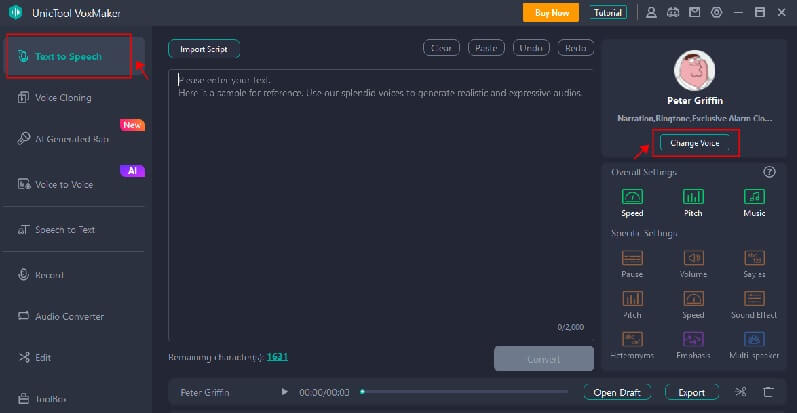 無需練習高超的配音技巧,也無需聘請昂貴的配音演員。在線嘗試以下方法彼得·格里夫文本轉語音。您有 3 次試用機會。如果您想無限次使用並嘗試更多名人聲音,請點擊“嘗試更多聲音”按鈕免費下載該軟件。