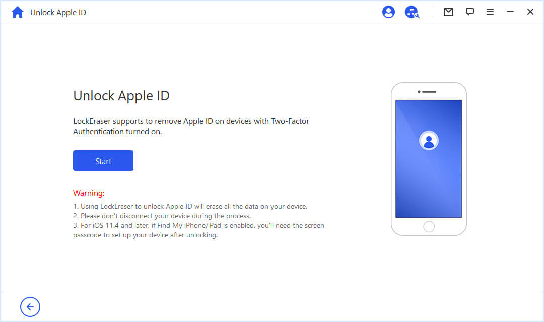 - 1從其官方網站安裝 LockEraser。然後,啟動它並打開“解鎖Apple ID”功能,如下圖所示。