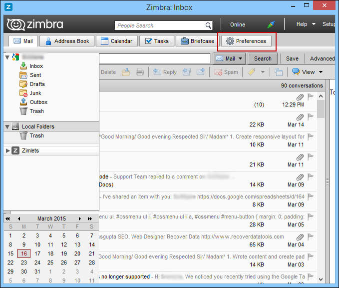 - 首先,在您的 PC 上打開 Zimbra 並導航到偏愛選項。