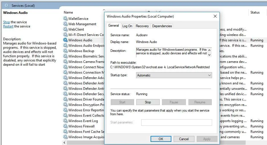 - 如果它沒有運行,請雙擊音頻服務以獲取其屬性。