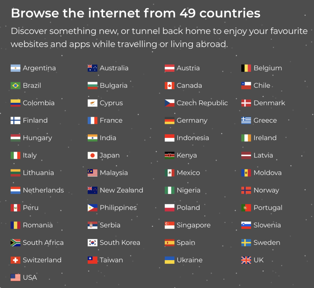 儘管深受用戶歡迎,TunnelBear服務器網絡歸根結底還是很小的。確切地說,它在 49 個國家/地區運營。