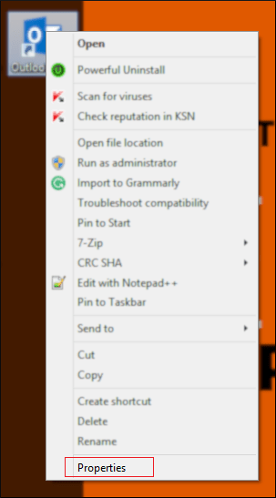 1. 右鍵單擊 Outlook 快捷方式並選擇屬性。