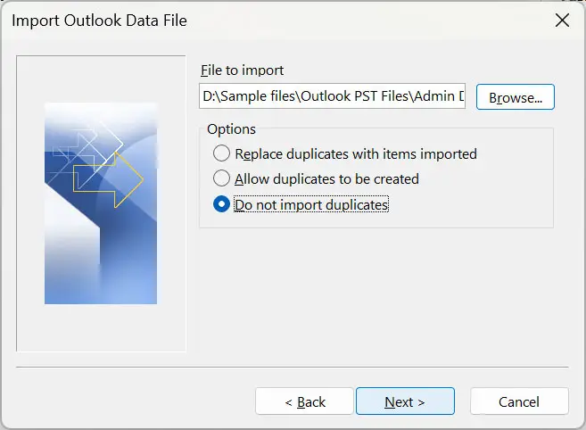 如果您要將電子郵件從 PST 文件導入到 Outlook 客戶端。然後必須啟用“不要導入重複項”選項如下圖所示。