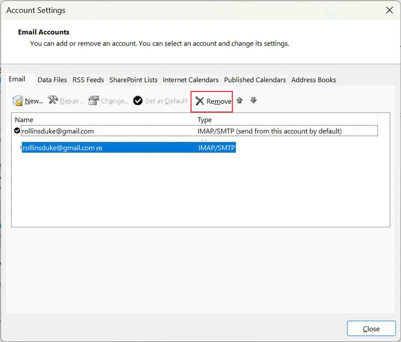 檢查電子郵件賬戶設置在 Outlook 中確保有沒有重複的帳戶在 Outlook 中配置。如果您看到使用不同協議配置的重複帳戶,請立即消除它。
