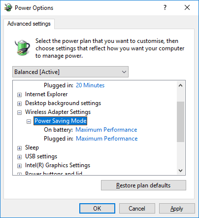 - 從彈出窗口中展開“無線適配器設置”,並將兩種情況(使用電池和插入充電器時)的設置更改為“最大性能”。
