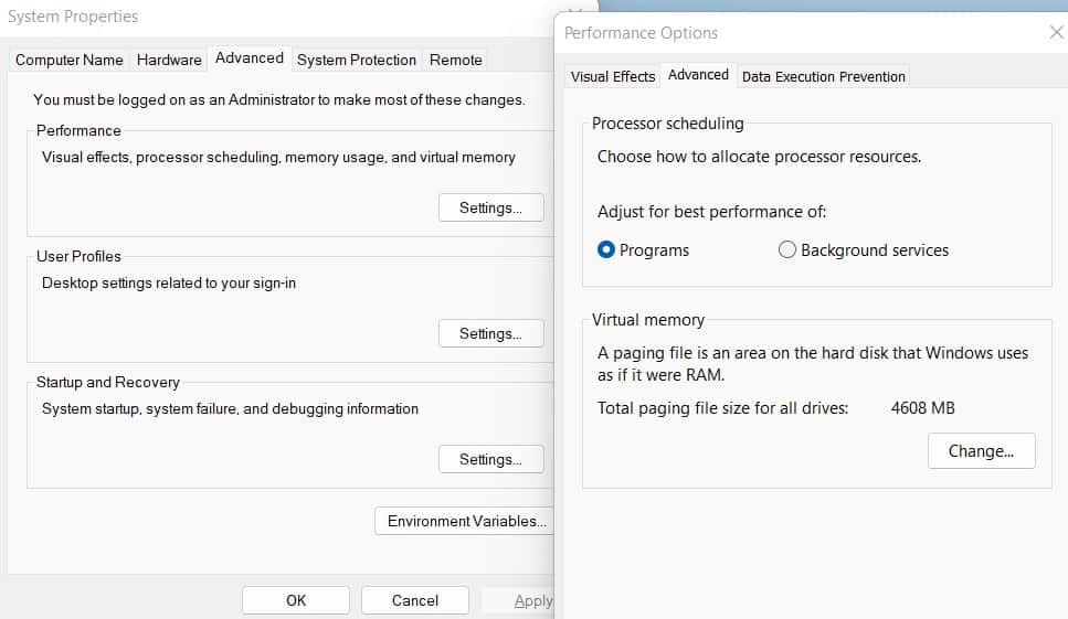 - 這將打開性能選項窗口,移至高級選項卡,然後在虛擬內存選項卡下單擊更改,