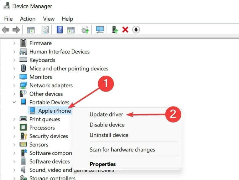 - 展開便攜式設備,右鍵單擊您的 iPhone,然後單擊“更新驅動程序”。