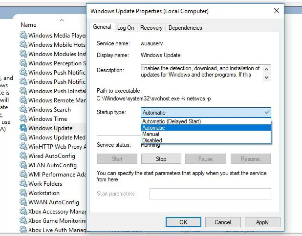 - 此處確保“啟動類型”設置為“自動”,並且服務狀態設置為“正在運行”。如果該服務未運行,請單擊“啟動”按鈕啟動它。