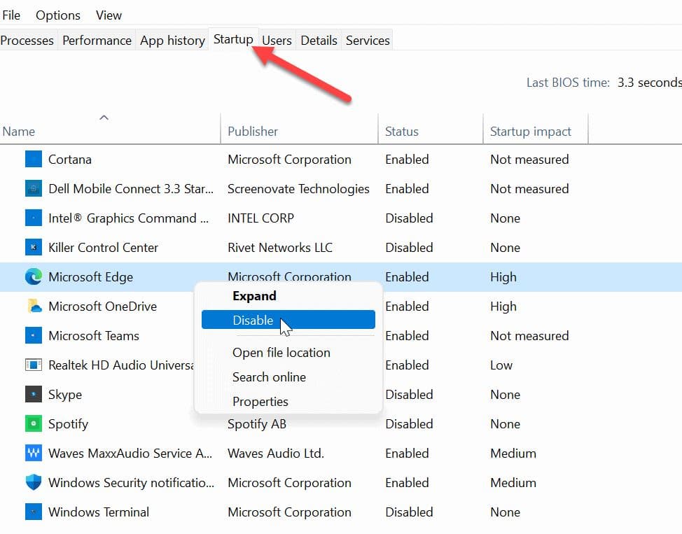 - 轉到啟動選項卡並單擊打開任務管理器。通過選擇每個啟動項並單擊“禁用”來禁用所有啟動項。
